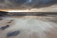 Op een stormachtige middag slaan de golven op de IJsselmeerkust bij Hindeloopen, terwijl de donkere lucht de sfeer dreigend maakt.