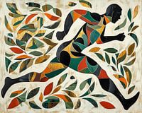 Hardlopen - Op dit sport schilderij zie je een donkere man in een dynamische hardlooppose, omringd door kleurrijke bladeren in verschillende tinten groen, bruin en oranje, wat een levendig en energiek gevoel oproept.