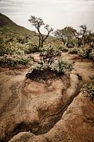 Deze fotografische scène toont een vulkanisch landschap dat door erosie is gebeeldhouwd, waar de okerkleurige aarde contrasteert met de herboren vegetatie die haar plaats probeert terug te winnen. Kleine groepjes groene struiken, bezaaid met licht bloeiende aren, klampen zich vast aan verhoogde blokken grond, alsof ze de door water en…