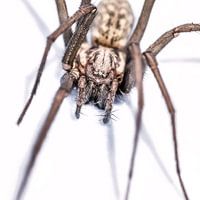 Macro opname van een spin in aanvalshouding op een witte ondergrond en schaduwen door t zonlicht