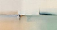 Dit schilderij is een zichtbaar gemaakte stilte - een stille ontmoeting tussen lucht en zee, herinnering en moment. Zacht beige gaat over in lichtgroen, terwijl een dunne, donkere horizon ze uit elkaar houdt... maar toch samenbrengt. Kijk dichterbij: vage lijnen fluisteren van verre gebouwen, halfherinnerde steden opgeslokt door mist.…