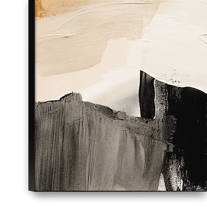 Abstracte compositie met gedurfde penseelstreken en een harmonieus kleurenpalet dat aardetinten combineert met monochrome zwart-wit accenten. De organische vormen en de gelaagdheid van de verf suggereren een landschap, met de bruine en beige vlakken die doen denken aan een woestijn of een droge aardkorst, terwijl de witte en grijze…