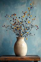 Harmonie in Keramiek is een kunstwerk dat een diep gevoel van nostalgie en vergankelijkheid oproept. De zachte, bijna tastbare textuur van de droogbloemen nodigt de kijker uit om de broosheid van het leven te overdenken. De warme, goudgele tinten van sommige bloemen contrasteren met de koelere blauwe en rode nuances, wat een gevoel van spanning tussen vreugde en melancholie creëert. De robuuste keramische vaas straalt een gevoel van stabiliteit uit te midden van de fragiele bloemen, als een metafoor voor de constante cycli van de natuur. Het zachte, diffuse licht dat over het tafereel valt, roept herinneringen op aan late zomermiddagen of vroege herfstdagen, waardoor een sfeer van contemplatie en innerlijke rust ontstaat. De subtiele geur van gedroogde bloemen lijkt bijna waarneembaar, wat de zintuiglijke ervaring versterkt. Dit werk nodigt de toeschouwer uit om stil te staan bij de schoonheid van het vergankelijke en de poëzie van alledaagse momenten, waardoor een diep gevoel van verbondenheid met de natuur en de passage van tijd wordt opgeroepen.