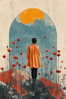 Dit kunstwerk toont een vrouw in een oranje gewaad, staand te midden van rode klaprozen, uitkijkend naar een landschap met een oranje zon of maan. De stijl combineert elementen van surrealisme en symbolisme met een vleugje Oosterse esthetiek. Het gebruik van een boogvormig kader, contrasterende kleuren en een dromerige atmosfeer creëert een gevoel van rust en introspectie. De digitale schilderkunst grijpen terug op de traditionele acryl- of olieverfschilderijen. De compositie, met de centrale figuur en de symmetrische plaatsing van de bloemen, roept associaties op met spirituele iconografie en het zoeken naar innerlijke balans.