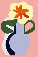 De achtergrond is een zacht roze dat een warm en rustig gevoel geeft, terwijl het onderwerp - een prominent weergegeven bloem en vaas - is opgebouwd uit zorgvuldig geselecteerde kleurvlakken die elkaar aanvullen. De bloem heeft een grote, ronde, gele kern met oranje bloemblaadjes, wat een levendig contrast vormt met het koele blauw van de vaas. Het groen van de bladeren brengt een gevoel van frisheid en natuurlijkheid. Het gebruik van negatieve ruimte en de afwezigheid van harde lijnen of realistische details nodigen de kijker uit tot contemplatie en bieden ruimte voor persoonlijke interpretatie.