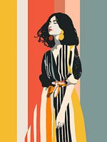 Een gedurfde, moderne illustratie van een vrouw in een gestreepte jurk tegen een achtergrond van kleurrijke verticale panelen. Het kunstwerk combineert mode, geometrie en levendige tinten om een opvallende visuele balans te creëren.