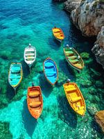 De boten, elk met een eigen uniek kleurenschema, variërend van levendig geel tot diepblauw en warm oranje, zijn kunstig gearrangeerd als waren het noten op een muzikale partituur. Hun schaduwen dansen op de zanderige zeebodem en creëren een dynamisch contrast met de zonovergoten oppervlakte. De ruwe, natuurlijke rotswanden omarmen het tafereel, waardoor een afgelegen en bijna verborgen gevoel ontstaat. De compositie is zowel levendig als rustgevend, met een balans tussen de stilte van de onbewogen boten en de beweging van het water.