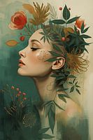 Een poëtisch portret waarin bloemenelementen en natuurlijke vormen samensmelten met het gezicht van een vrouw. De compositie belichaamt rust, nabijheid tot de natuur en artistieke verfijning.