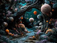 Stap in een surrealistisch droomlandschap waar natuur en abstractie elkaar ontmoeten in een betoverend samenspel. Torenhoge kristallen bomen met fractale takken staan naast zwevende bollen en kubussen in elektrische kleuren als neonroze en teal.