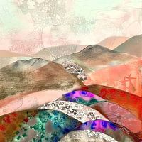 Abstract landschap, een fusie van organische vormen en geometrische patronen. Het kleurenpalet is zacht en varieert van warme roze en rode tinten tot koele blauwe en neutrale beige en grijze nuances. De compositie doet denken aan een topografische kaart met heuvelachtige contouren en een rivier die het landschap doorsnijdt. De combinatie van transparante lagen en dichtere, meer uitgesproken vormen suggereert diepte en textuur.