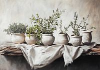 Dit stilleven vangt de subtiele schoonheid van eenvoud en balans. Groene planten, levendig en vol leven, staan in strakke witte potten die elegantie en zuiverheid uitstralen. De potten zijn geplaatst op een oud, verweerd stuk hout, waarvan de diepe nerven en ruwe textuur een prachtig contrast vormen met de gladde, minimalistische potten. De witte achtergrond versterkt het serene gevoel van het tafereel, waardoor de rijke groene tinten van de planten nog meer tot hun recht komen. Het samenspel van de natuurlijke elementen en het ingetogen kleurenpalet creëert een sfeer van rust en harmonie, waarbij de kracht van eenvoud centraal staat. Passend bij diverse stijlen en trends waaronder landelijk, wit, sober, botanisch. Artist: Bianca ter Riet. Linen, hout.
