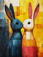 Konijn, kus, liefde, harmonie, contrasten, modern design, abstracte kunst, dierlijk motief, kleurrijke decoratie, romantisch cadeau, woonkamer kunst, geometrisch schilderij, symbolische kunst, creatief interieurontwerp