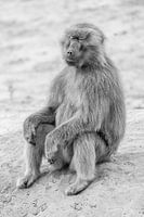 Deze prachtige fine art foto toont een ontspannen baviaan met zijn ogen dicht, vastgelegd in zwart wit. Het beeld straalt rust en sereniteit uit, en vangt het moment van pure ontspanning van dit majestueuze dier.