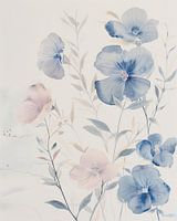 Delicate en verfijnde compositie van bloemen, die een serene en elegante sfeer uitstralen. De kleuren zijn zacht en ingetogen, met een combinatie van lichtroze bloemen en blauwe bladeren die harmonieus samenkomen tegen een witte achtergrond. Deze subtiele kleurencombinatie geeft het kunstwerk een gevoel van rust en verfijning.