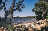Het Zarnowitzmeer in Lubkowo werd hier gefotografeerd op een mooie zomerdag in 2018. Het strand was verlaten en het weer was een droom.
