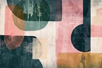 Deze aantrekkelijke geometrische compositie combineert zachte tinten roze, groen en blauw met strakke lijnen en vormen. Het harmonieuze kleurenpalet en de overlappende elementen creëren een rustige maar moderne sfeer die perfect is voor stijlvolle woonruimtes en kantoren. De zachte overgangen en evenwichtige opstelling van geometrische vormen geven het schilderij een esthetische elegantie. Ideaal voor kunstliefhebbers die op zoek zijn naar een discrete maar expressieve wanddecoratie.