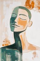 Een harmonieus samenspel van zachte, aardse kleuren en minimalistische vormen betovert de kijker. De expressieve gezichtsuitdrukking straalt rust en tevredenheid uit, terwijl de heldere lijnen en zachte tinten een moderne elegantie uitstralen. Dit kunstwerk past perfect in een stijlvolle woonkamer en creëert een ontspannen sfeer.