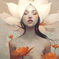 Portret van een lotusbloem meisje in zachte pastels met voornamelijk oranje en zand tinten.