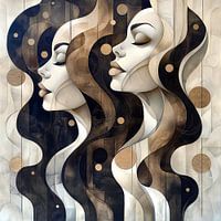 Abstracte figuratieve kunst met vloeiende vormen in aardetinten met goud accenten.