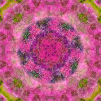 Harmonieuze mandala van bloemenfoto's in roze en geel-groen kleurenschema.