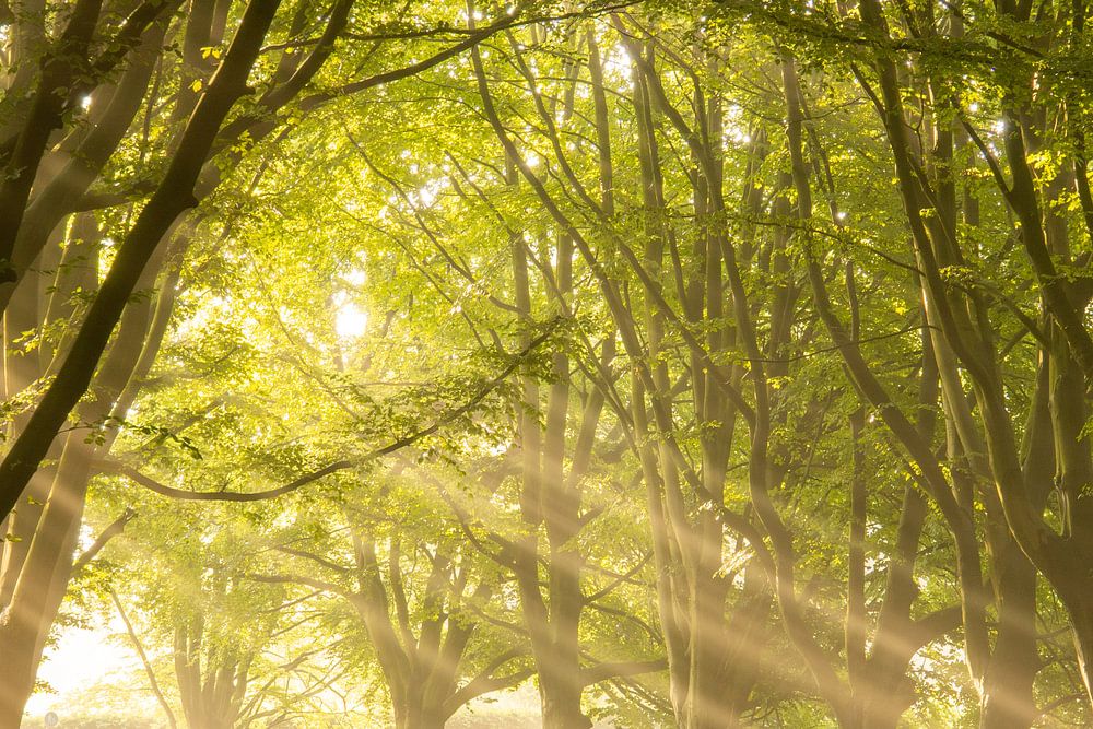 Krachtige lichtstralen vallen door de mist op een zonnige lenteochtend en verlichten een bospad in het Amsterdamse Bos