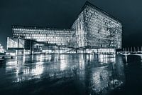 Harpa is in de avonduren mooi verlicht. Door de reflectie van het natte plein in de voorgrond krijgt het gebouw extra body.