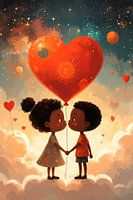 Een illustratie van twee kleine donkere kindjes, een jongen en een meisje, ze staan op de wolken en houden heel veel van elkaar. Ze staan hand in hand en kijken elkaar verliefd aan terwijl er blosjes op hun wangen verschijnen. In hun hand hebben ze een ballon in de vorm van een rood hart. Een magisch moment, vriendschap en liefde tussen…