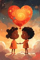 Een illustratie van twee kleine donkere meisjes, ze staan op de wolken en kijken samen naar het rode ballon hart dat ze samen vast hebben. Het hart is versiert met strepen en cirkels in lichtere kleuren. Ze staan hand in hand en hebben blosjes op hun wangen, een magisch moment, vriendschap en liefde tussen kinderen, puur en echt. De…