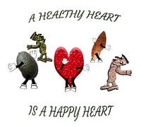 Cartoon A happy healthy heart dancing between healthy foods, legumes (beans and lentils), a sweet potato, an avocado and oats.
