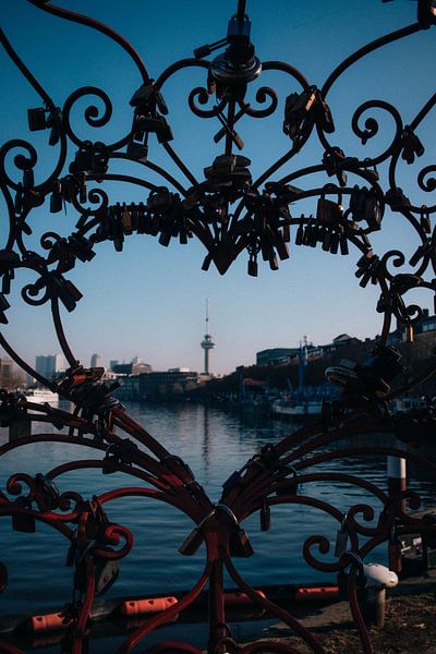 Een hartvormig hek vol liefdesslotjes op de voorgrond, met uitzicht over het water richting de Euromast in Rotterdam.