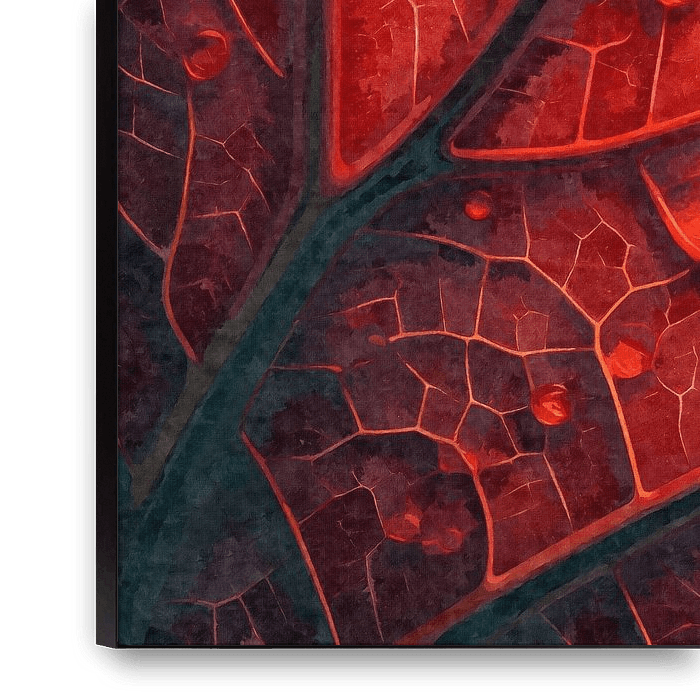 Dit gedetailleerde natuurmotief toont een herfstkleurig blad in intense rode, oranje en gele tinten. De fijne nerven komen duidelijk naar voren en vormen een fascinerend netwerk van natuurlijke structuren. Kleine druppels op het oppervlak geven het beeld extra diepte en levendigheid. De compositie oogt tegelijkertijd organisch, krachtig…