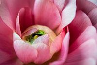 Hart van een roze roos. De knop gaat steeds verder open, het hart geeft zich bloot. De stamper is net te zien.