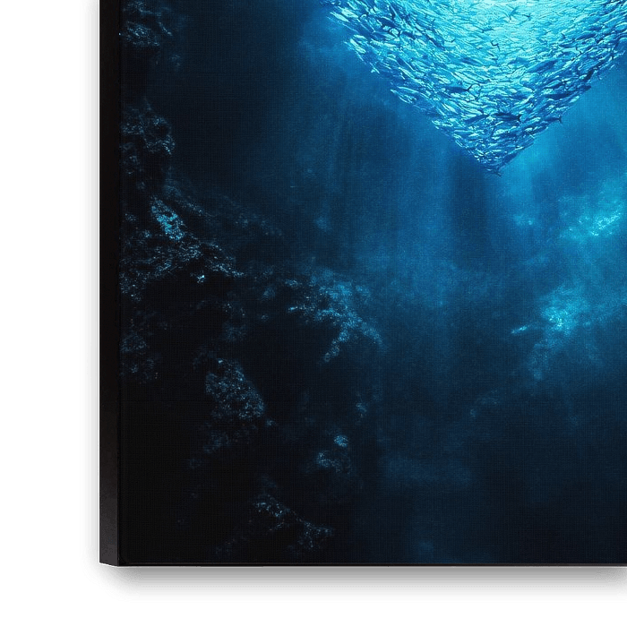 Een betoverend ontwerp dat de schoonheid van de onderwaterwereld laat zien. Deze afbeelding toont een magische school vissen die samen een perfecte hartvorm vormen, badend in een mysterieuze blauwe gloed. Het licht dat door het water breekt, creëert een bijna spiritueel gevoel, ideaal voor wie houdt van kunst die zowel rustgevend als inspirerend is. Perfect om een slaapkamer of kantoor een serene en unieke sfeer te geven.