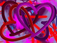 Een expressief schilderij van een overvloed aan wilde harten. Belangrijke kleuren zijn paars, roze en rood.