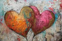Dit speelse en kleurrijke werk vangt de vreugde van liefde en verbinding. Met een levendig palet van hartvormige motieven creëert het een warme en uitnodigende sfeer die elke ruimte verlevendigt.