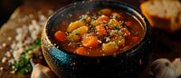 Een stevig stoombad van kleurrijke groenten, verpakt in een rustieke zwarte pot, nodigt je uit om te genieten. De levendige kleuren van de wortelen en aardappelen harmoniëren perfect met het smakelijke garnituur. Dit zicht is ideaal voor in de keuken en straalt een gevoel van warmte en gastvrijheid uit, perfect voor gezellige kookavonden.