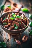 Een verleidelijk gerecht schittert in een rustiek houten bord, aromatische kruiden en malse stukjes vlees beloven culinaire avonturen. De warme kleuren en uitnodigende presentatie creëren een gezellige sfeer die perfect past in een keuken of eetkamer. Hier wordt koken een belevenis en wordt de gemeenschap aan tafel uitgenodigd.