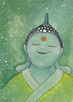 Boeddha in het groen met een lieve glimlach. De kleur groen is gekozen omdat onze hartchakra groen is. Het origineel is gemaakt op karton en heeft een formaat van 16x23cm