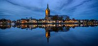 Hasselt aan de oever van het Zwarte Water tijdens het blauwe uur zonsondergang in Overijssel, Nederland. De skyline van de Hanzestad wordt weerspiegeld in de rivier met de Grote of Stephanuskerk in het midden.