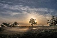 Landschap op de Hatertse en Overasseltse vennen bij Nijmegen in Gelderland, waar de zon opkomt achter een boompje in de nevel, onder een blauwe en licht bewolkte lucht.
