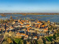 Luchtfoto van Hattem op de oever van de IJssel met hoge waterstand op de uiterwaarden in de Hoenwaard bij Hattem na een lange periode van hevige regen stroomopwaarts in januari 2024.