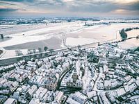 Luchtfoto van Hattem tijdens een koude winterochtend met sneeuw op de daken van bovenaf gezien. De stad Hattem grenst aan de ene kant aan de bossen van 'De Veluwe' en ligt aan de andere kant aan de rivier de IJssel, die te zien is op de achtergrond.