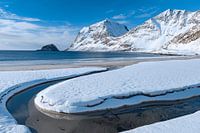 Klein stroompje water dat naar de zee stroomt op het strand van Haukland bij de stad Lekness in de Lofoten archipel in Norldland, Noorwegen. Het is een mooie winterdag.