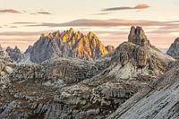 Uitzicht op de Haunoldgruppe in de Sesto Dolomieten, verlicht door de eerste zonnestralen van de dag. Rechts ziet u de Sextner Stein en de Toblinger Knoten, een berg direct achter de Dreizinnenhütte.