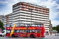 Een rode toeristenbus sightseeing Berlin kruist het Alexanderplatz in het centrum van Berlijn. Op de achtergrond het Haus der Statistik waarop met grote rode letters de tekst "Stop wars" staat geschreven. Deze foto is gemaakt in de Zomer van 2017