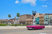 Foto die zo uit een film zou kunnen komen. Een paarse oldtimer met de straatjes van Havana duidelijk herkenbaar op de achtergrond
