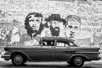 De vervallen klassieke Amerikaanse auto is afkomstig uit een tijd die stil is blijven staan na de revolutie door de helden op de achtergrond