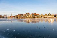 Uitzicht over een bevroren haven van Volendam tijdens zonsopkomst.