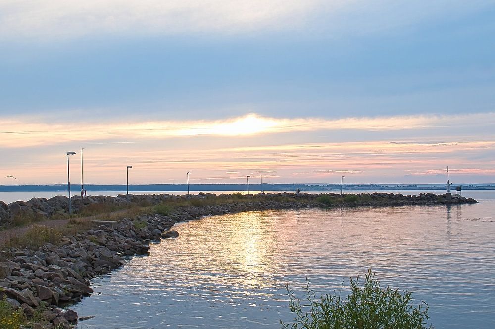 Haven met zonsondergang aan het Vaetternmeer in Zweden. Romantische avondsfeer, met brandende lucht in rood en oranje. Genomen in Scandinavië, Zweden.