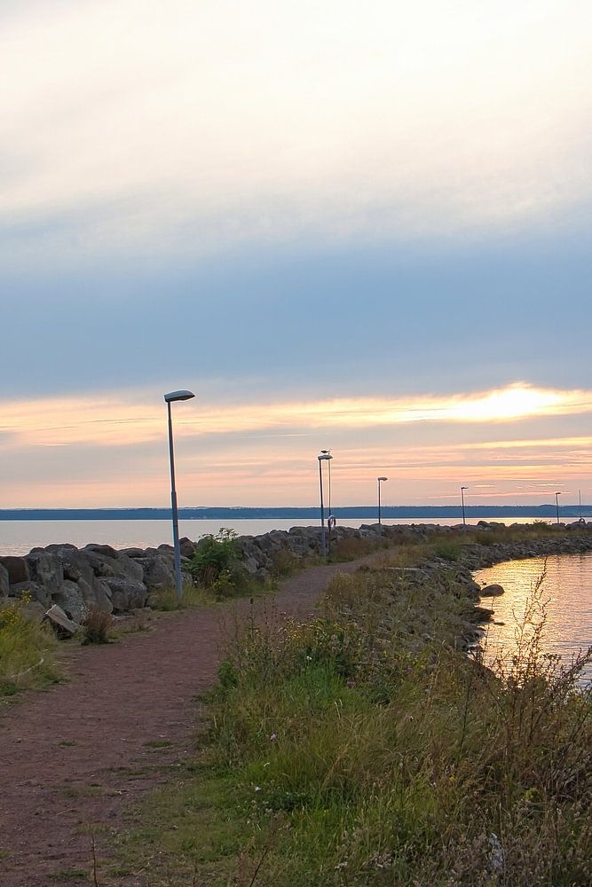 Haven met zonsondergang aan het Vaetternmeer in Zweden. Romantische avondsfeer, met brandende lucht in rood en oranje. Genomen in Scandinavië, Zweden.